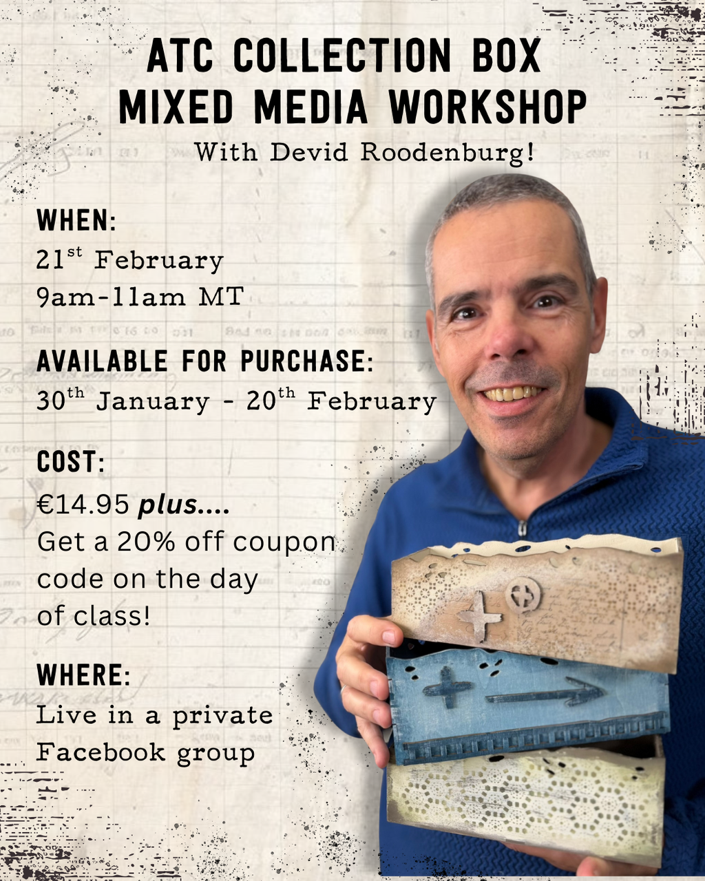 Join Devid for the ‘ATC Collection Box Mixed Media Workshop’ on February 21st and unleash your creativity in this hands-on, fun-filled 2hr class where you'll learn 3 unique techniques to decorate your ATC collection box.